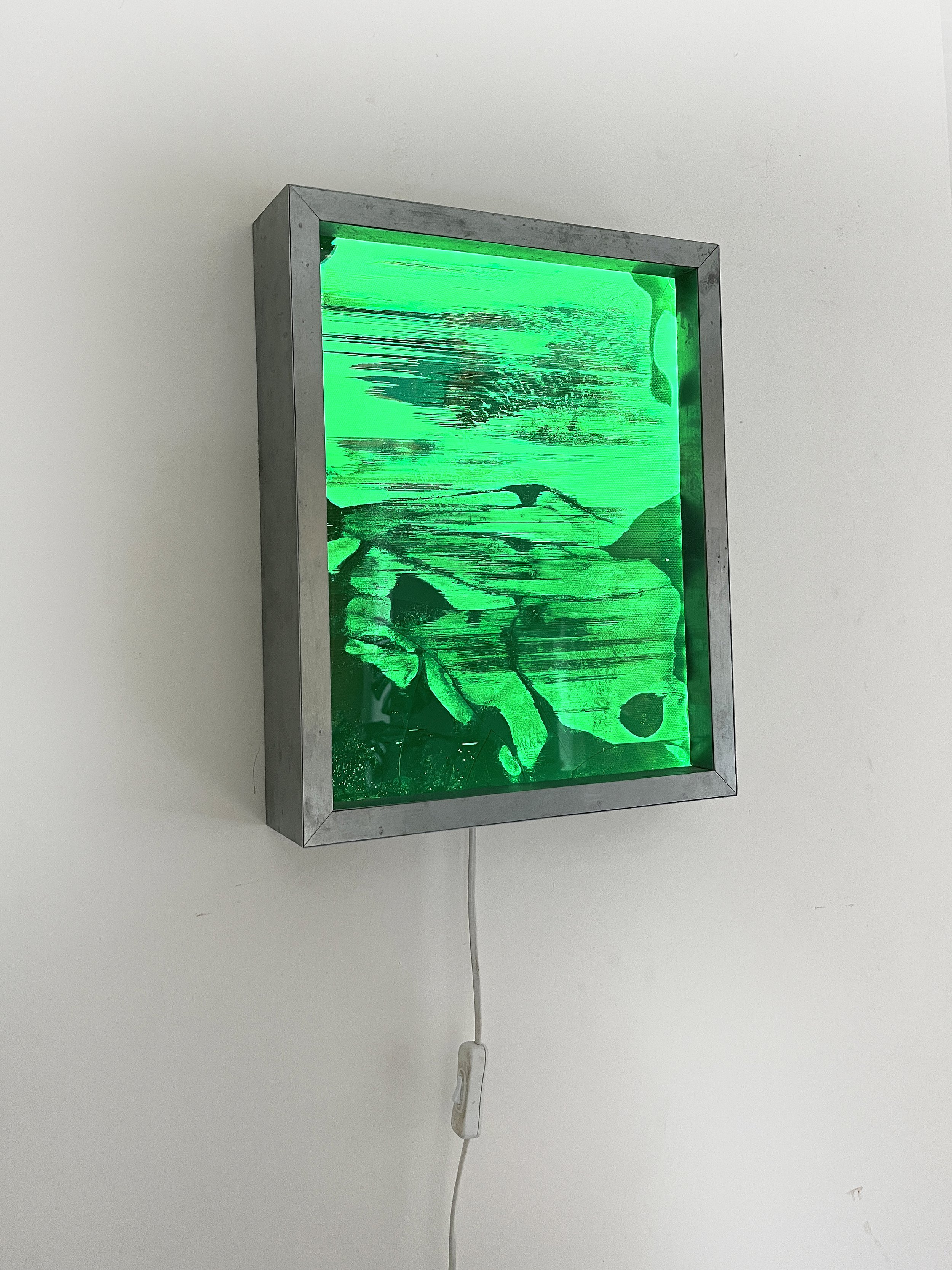 40,5x33x8cm. Aluminium frame, ledstrip, led-controller, plexiglass, old monitor. fluids.